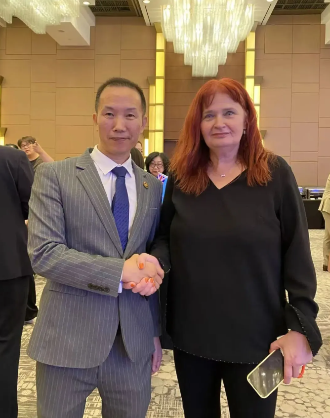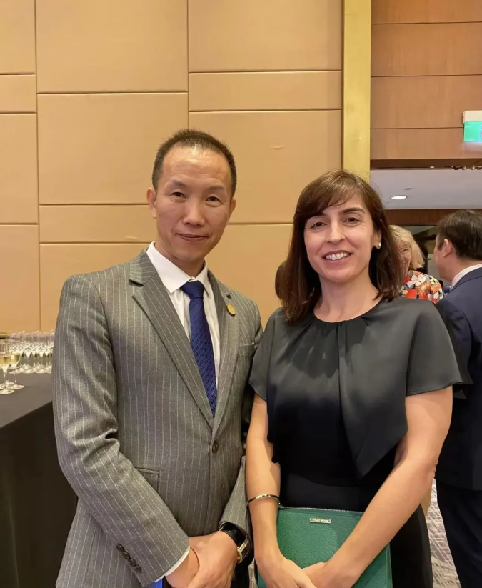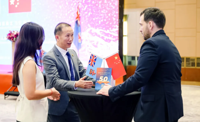 致辞环节,斐济总领事陈玉茹博士温情回顾中斐建交半世纪的合作硕果,字里行间满是对未来携手共进的期许。斐济是“太平洋上的一颗明珠”,是“坚韧、团结和多元”的象征。斐济是第一个与中华人民共和国建交的太平洋岛国。陈博士指出,中斐建立友好互利关系50年来,两国贸易和投资显著增长。她还强调,斐济将继续致力于促进与中国的贸易和投资关系,促进文化交流和旅游。最后,陈博士向所有来宾表示诚挚的感谢,同时表示希望在未来继续为和平、繁荣和共同成功而努力。随后,总领事邀请中方领导共同举杯,以美酒为媒,祈愿两国友谊长青、合作再攀新高。在全场热烈的掌声中,双方领导一同切开寓意美好联结的庆典蛋糕,将这一见证中斐情谊的历史性时刻定格。朱迪会长在活动中与陈玉茹博士及多国使节深入交流,对中斐建交50 年来的合作成就表示高度赞赏。朱迪会长(右)与奥地利驻上海总领事Helmut Rakowitsch(左)合影朱迪会长(右)与墨西哥驻上海总领事Miguel Angel Isidro(左)合影朱迪会长(左)与斯洛文尼亚驻上海总领馆馆长Mira Lesjak(右)合影朱迪会长(中)与新西兰驻上海总领事Ardi Barnard(左)、澳大利亚驻上海副总领事Chelsea Porter(右)合影朱迪会长(左)与葡萄牙驻上海总领事Sílvia Inácio(右)合影朱迪会长(中)与罗马尼亚驻上海领事馆商务参赞Andrei Panait(左)亲切交谈此次出席不仅见证了中斐友谊的深厚底蕴,更为未来参与两国跨领域合作搭建了重要桥梁。相信在双方的共同努力下,中斐这颗 “太平洋上的明珠” 与东方大国的友谊之树,必将结出更丰硕的果实。