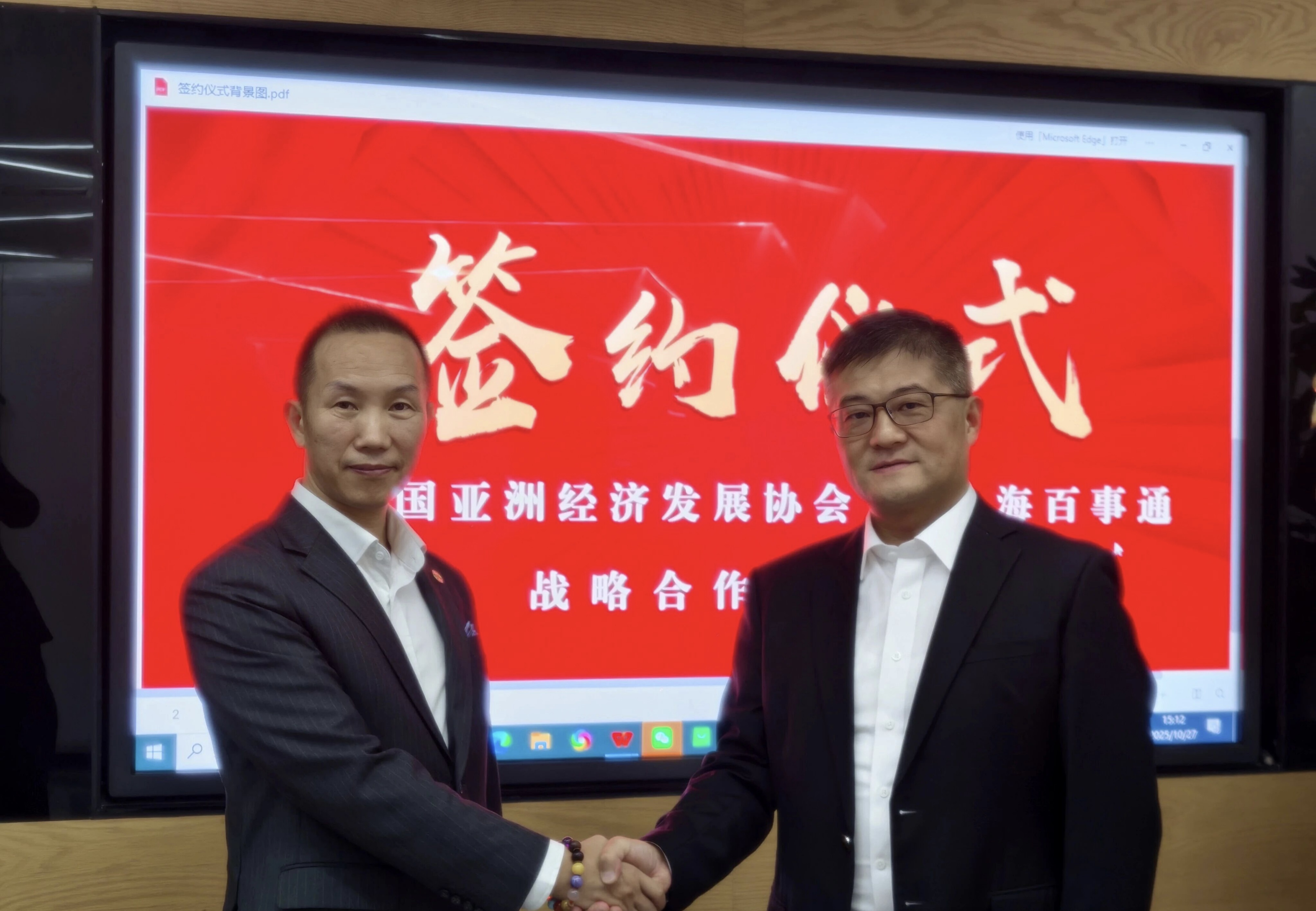 2025年10月27日,一场旨在赋能中国企业全球化发展的战略合作签约仪式在万众期待中圆满落幕 ——亚经协对外投资工作委员会(以下简称 “委员会”)与上海百事通信息技术股份有限公司正式成为战略合作伙伴。委员会会长朱迪、执行会长奚明杰、文旅部部长林艳率领核心骨干团队悉数到场,与上海百事通金振华总及核心业务成员共同见证了这一重要时刻。随着签约笔落下,双方正式开启资源共享、优势互补的深度合作新篇章,未来将以协同之力为中国企业出海之路铺就坚实桥梁。
