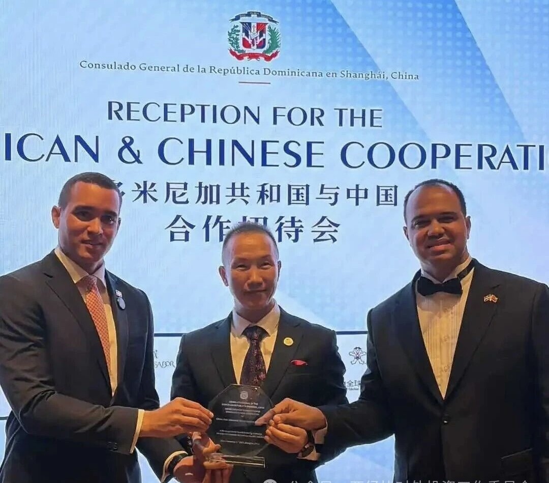 多米尼加驻华大使Jose Julio Gomez(左)与驻沪总领事Carlos Mendieta(右)向亚经协对外投资工作委员会朱迪会长(中)予以表彰