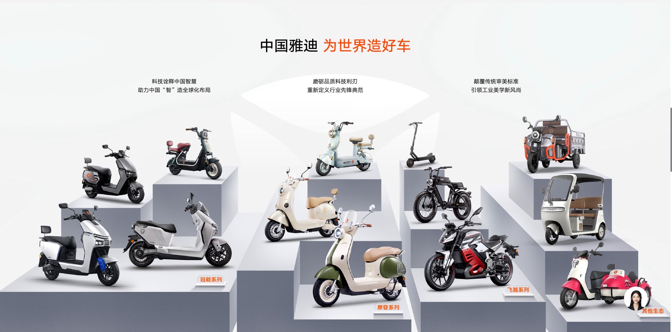 雅迪科技集团股份有限公司(Yadea Technology Group)成立于2001年,是全球领先的两轮电动车制造商,专注于高端电动自行车、电动摩托车、电动踏板车、锂电系统及智慧出行解决方案的研发与生产。