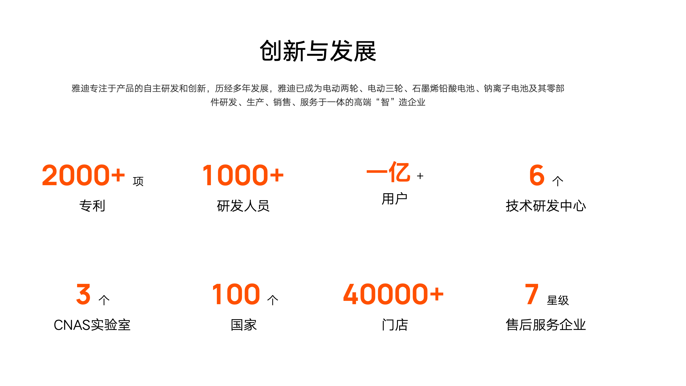 雅迪以科技创新推动绿色出行革命,致力于为全球用户提供更高端、更高性能、更安全、更环保的电动出行产品。